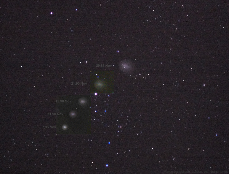 Marco Langbroek, Leiden, The Netherlands, combined several images taken between 8 and 29 November 2007 with a Canon Digital Ixus 400 at maximum zoom to show the slow movement of 17P through Perseus past Mirfak aka α Persei. It also nicely shows the increasing size, and decreasing surface brightness. |